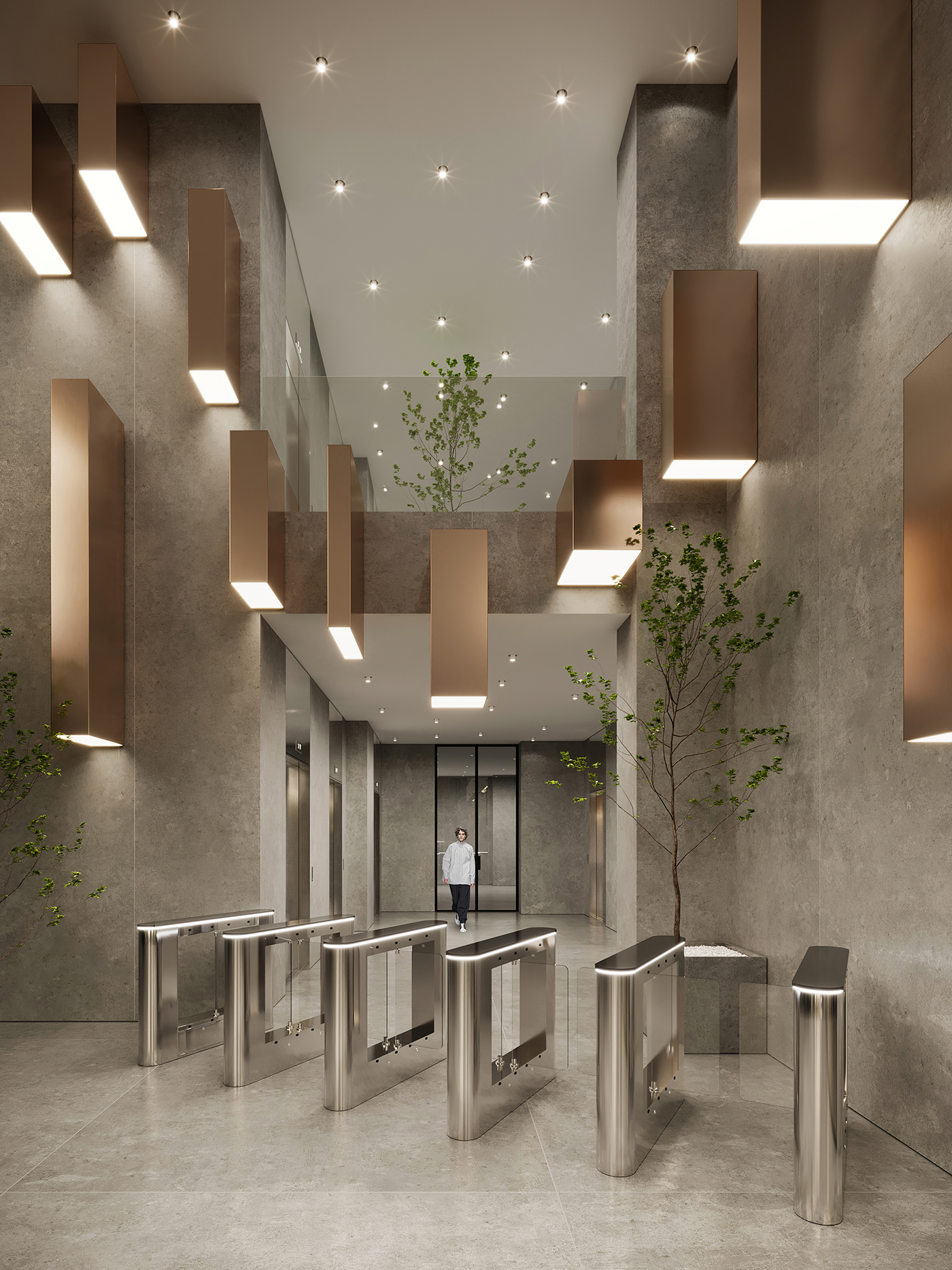 В центральном холле резидентов встречает футуристический ансамбль с выразительным акцентным освещением и динамикой форм.